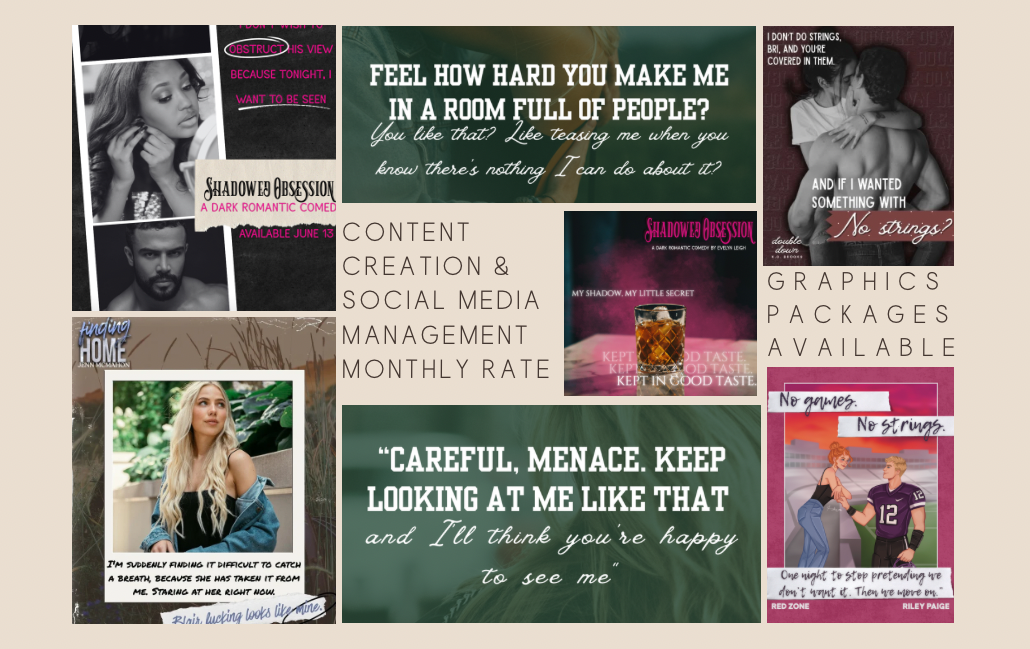 I struggle with giving up control of content creation and she made sure to keep with the vibes I was looking for, color brand and aesthetic. As a reader, she pulled the best scenes for content pull for me to use in promotion which is so hard for the author to do! I already can’t wait to work with her again for the next book! Highly recommend adding her to your team!”